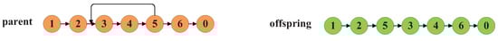 In the mutation operation, we use insertion mutation to mutate the chromosomes. The mutation process is shown in Figure 5. The parent chromosome randomly selects one gene, and inserts this gene to a random position, then the offspring chromosome is generated.