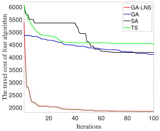 A comparison of travel cost with the GA-LNS, GA, SA and TS algorithm.