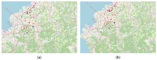 In this section, we consider two different cases acquired from the OpenStreetMap (OSM) in Ichihara city, Japan. The post-disaster transportation network in Figure 7 has about 11,000 vertices and more than 15,000 arcs composed of vertices. In Figure 7a, there are 4 depots and 48 shelters, which is called case 1 for short; in Figure 7b, there are 4 depots and 60 shelters, which is called case 2 for short. The locations of depots and shelters are shown in Figure 7. The blue squares represent the depots. The red circles represent the shelters.