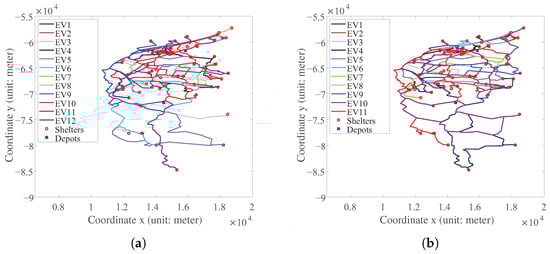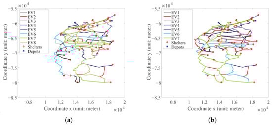 The two cases have some of the same settings. The service time of each shelter was set to min, and their demand was set to units. These data can be easily modified to adapt to the changes of different shelters. The capacity of each EV was units, and the velocity of each EV was v = 30 km/h. In case 1, we considered that up to 8 EVs can be used; in case 2, we considered using up to 12 EVs. We aimed to find the optimal delivery scheme while minimizing the total travel cost. We considered the different priorities of shelters by changing the time windows in Table 5. Numbers 0–51 were the information of the depots and shelters of case 1. Numbers 0–63 were the information of the depots and shelters of case 2. In Table 5, columns 1 and 5 are the shelter and depot numbers. Columns 2 and 6 are the coordinates of the shelter and depot (unit: miter), where the coordinate system is the European petroleum survey group: 6677 (EPSG:6677). TW1 and TW2 represent two different time windows (unit: minute). The parameters of GA-LNS are the same as those in Section 5.1. The simulation results and the data of different cases are shown in Figure 8 and Figure 9. The specific routes of the delivery scheme for two cases are shown in Table 6 and Table 7, respectively. It can be seen that the constraints of different time windows affect the optimal delivery scheme of EVs.