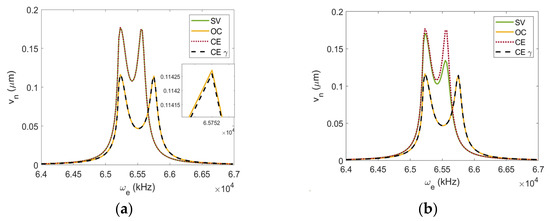 A properly working gyroscope should be capable of accurate determination of the angular velocity of an object. To accomplish this, it is critical to evaluate the gyroscope’s ability to detect changes in the system’s base rotation. To investigate this further, the effects of the rotational velocity (at optimum load resistance) on the output voltage as well as the displacements of the driving and sensing modes are explored using the four different models. Using an excitation frequency near the driving resonance frequency, Figure 13 shows graphs of the shifts in driving and sensing positions, as well as the generated voltage responses of the multifunctional gyroscope when the base rotation rate, , is varied. Low DC (1 V) and AC (0.1 V) voltages are selected for the numerical investigation to avoid dynamic pull-in behavior. The driving displacements shown in Figure 13a indicate that for any range of base rotation, , the SV, OC, and CE- models are in good agreement, while the CE model only agrees with the other models when the base rotation is less than . By inspecting the sensing displacements and voltage harvested as shown in Figure 13b,c, the models vary significantly depending on the base rotation value. Table 3 shows the voltage relative error between the OC, CE, and CE- models with respect to the SV model for different base rotation values. At low base rotation, the models agree well with one another. However, as the rotation is increased, we observe the appearance of notable differences between all four models. The OC and CE models remain relatively close to one another until the base rotation gets larger than 200 . It is noticed that the CE- model has the least relative error for all values of base rotations investigated, while the CE model has the most relative error.