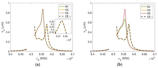 Figure 7a shows that the output voltage is significantly overestimated by the OC model for a near short-circuit situation, as open-circuit conditions are assumed. When the load resistance is increased to , the SV, CE, and CE- models feature increases in amplitude because they are approaching optimum load resistance for harvested energy, which can be seen in Figure 7c. Notably, the CE model closely matches the SV model near the driving resonance frequency but falls short near the sensing frequency because of the missing coupling terms in the sensing equation. The most significant difference may be seen between the models when using the load resistance that is considered to be optimal. Here, the CE- model closely matches the SV model near the driving resonance frequency but also falls short near the sensing frequency because of the missing coupling terms in the sensing equation. The SV model is dependent on load resistance; hence, it is the only model that can be considered as valid when close to the optimum load resistance. Furthermore, considering a high-load resistance value, , the agreement between SV, OC, and CE- models is high. This is due to the fact that, at a high-load resistance, the SV and CE- models should be mathematically equivalent to the OC model.