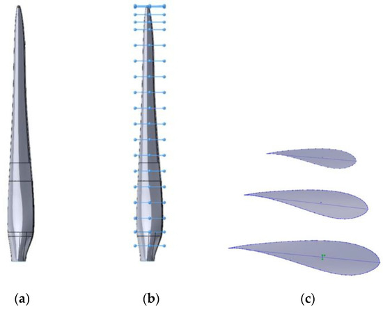 (a) Blade models acquired through scanning; (b) sectional segmentation for airfoil extraction; (c) blade airfoil for each section acquired.