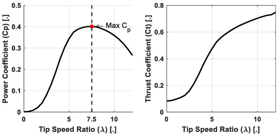 Figure 3 shows the changes in power and thrust coefficient depending on the tip speed ratio change, which is the result of the Qblade simulation of the target wind turbine rotor. In the figure, the power coefficient represents the efficiency of converting the wind power to the mechanical power of the rotor, and the thrust coefficient represents the ratio of the thrust received from the wind divided by the dynamic force of the wind. The power coefficient and thrust coefficient are mathematically defined by Equations (2) and (3), respectively. is the output power, is the thrust force of wind turbine, is the air density, is the rotational area, and is the wind speed [27].