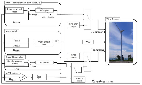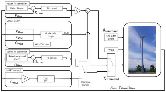 Figure 4 shows the power control algorithm of the variable speed variable pitch wind turbine with a mode switch. The algorithm consists of pitch PI control, torque schedule, speed PI control, position switch, and mode switch. The torque schedule is a lookup table for outputting generator torque for maximizing a power coefficient using a generator speed as an input. In other words, control by torque schedule is an open-loop control applied to maintain the optimal tip speed ratio to maximize the power coefficient and is created based on the steady-state rotor analysis using the blade element momentum theory. The position switch is used to combine the maximum power coefficient control and the speed PI control. The position switch receives three inputs. One is the upper limit, which is the maximum generator torque set value, the other is the lower limit, which is the output from the torque schedule look-up table for maximum power coefficient, and the third is the command from the speed PI controller. If the output torque from the speed PI controller is in between the maximum generator torque and the minimum from the torque schedule, the speed PI controller is used to maintain the rated generator speed. If the output torque of the speed PI controller is lower than the lower limit of the position switch, the torque schedule is used to achieve the maximum power coefficient. is the measured power, is the measured rotational speed, and is the measured pitch angle.