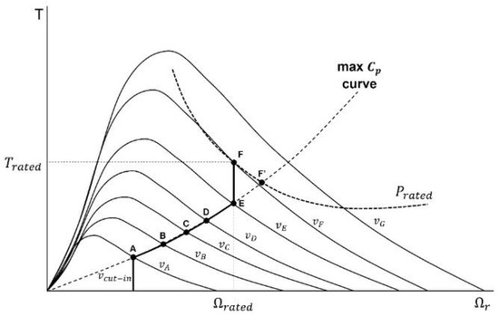 Figure 5 shows the operating points of a variable-speed variable-pitch wind turbine on the rotor torque and the rotor speed diagram. In the figure, the operating points along the maximum Cp curve (A-B-C-D-E) represents the MPPT control in Region II. The transition control in region II-1/2 can be either E-F or E-F’ by the limitation on the rated rotor speed. If the rated rotor speed is reached before the rated power is achieved at a given wind speed, the path E-F should be used as the operating points. The point E or F’ represents the control in Region III to maintain the rated power.
