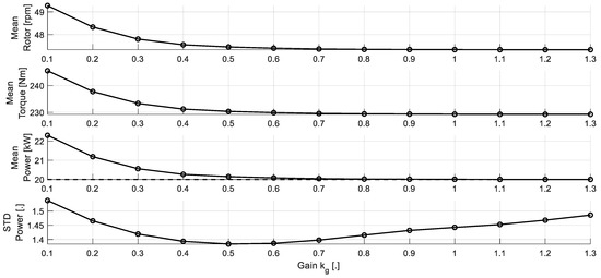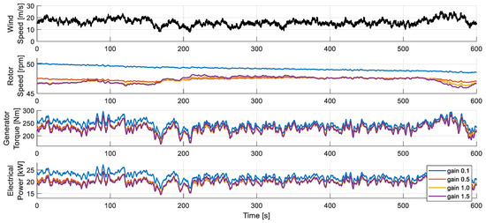 In order to quantitatively confirm the effect of the gain, , simulations were performed at an average wind speed of 16 m/s. Looking at Figure 9, it can be seen that the power tracking performance varies depending on the magnitude of the gain, the larger the gain, the lower the rotational speed, and the electrical power. As the gain increases, the mean value of the electrical power seems to approach the rated power. Figure 10 shows the dynamic simulation results to which various gains of are applied. The selected gains were 0.1, 0.5, 1 (base), and 1.5.