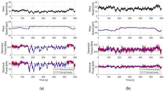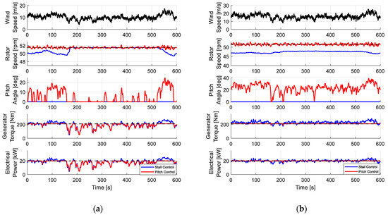 Figure 14 shows the simulation results using the same wind at mean wind speeds of 10 m/s and 16 m/s. According to the result of Figure 14a, since the same control is carried out from 180 s to 500 s, which is a part below the rated wind speed, it can be confirmed that the same rotor speed and output power are obtained. Figure 14b shows that the proposed stall controller has relatively smaller deviation at torque and output power in the simulation above the rated wind speed. The results of Table 6 and Table 7 show that there is no significant difference when comparing the average values of rotational speed, torque, and power for two cases. However, unlike the rotational speed, the standard deviation differs in the generator torque and output power, and the difference is up to 24% above the rated wind speed. In this case, the difference in rotational speed is not large, but the deviation of output power increases due to the deviation of torque. The two control methods may be the same in function, but it was confirmed that there is a slight difference in torque deviation.