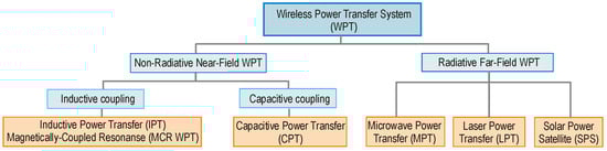 Wireless power transfer (WPT) systems are used in many fields such as electric vehicle charging [1,2,3,4], electric vehicles (PHEVs) [5,6], implantable medical devices (IMDs) [7,8,9], and consumer electronics [10,11]. WPT technology is used in robotic systems [12], communication sets [13,14,15], and in the Internet of Things (IoT) [12,13]. WPT technology is divided into two main classes (Figure 1). The first is the radiated far-field WPT [16,17,18]. The second group is a non-radiated near-field WPT.