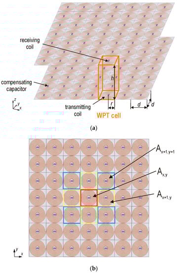 In the analyzed models, it is possible to select the power supply conditions depending on the requirements. Multiple receivers can be powered simultaneously. The considered cell Ax+m,y+n (Figure 2b) is part of an array, where m is the column number and n is the row number.
