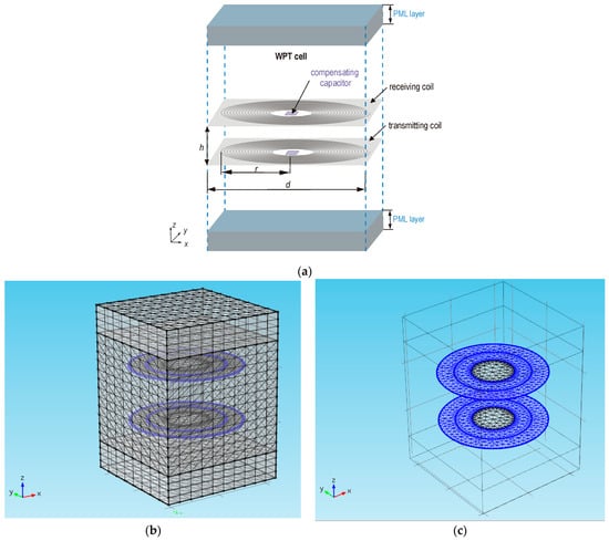 The analyzed models had the following variables: coil radius (r), distance between the transmitting and receiving coils (h), and the number of turns (n). The coils are made of a very thin copper wire (wd = 200 µm), an electrical insulator with a thickness (wi = 5 µm), and wire conductivity (σc = 5.6 × 107 S/m). The analyzed cell is filled with air (Figure 3). The compensation capacitor was modelled as a lumped element with capacitance (C). With periodic boundary conditions (PBC) [38,39,40,41,42], it is possible to simplify the model to a single cell filled with air and composed of a Tx-Rx pair. Periodic conditions were provided on surfaces parallel to the Z-axis. Using the finite element method, the entire area needs to be digitized. A perfectly matched layer (PML) was used to simulate an unrestricted environment, which prevents wave reflections from the boundaries of the area. Two additional layers (PML) were introduced at the top and bottom of the WPT cell (Figure 3a).