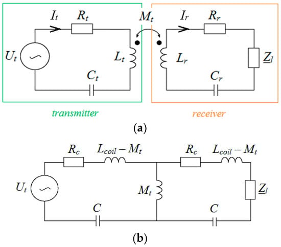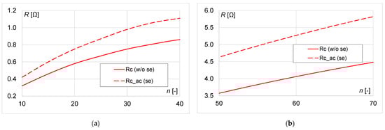 Taking into account that the transmitter and receiver coils are identical, the resistances of the inductors are Rt = Rr = Rc. The formulas for Rc for the case without the skin effect, Equation (12), and for the case with the skin effect, Equation (13), are presented by
