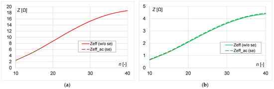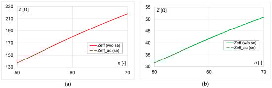 In the maximum efficiency procedure, the impedances of the receiver Zeff and Zeff_ac were calculated based on Equations (20) and (21). Calculations for different n and h are shown in Figure 5 for a small coil and in Figure 6 for a large coil. The analysis showed that the influence of the skin effect on the impedance values was negligible. Increasing n causes a linear increase in impedance for a coil of r = 0.025 m and a non-linear increase for a coil of r = 0.01 m. Regardless of the coil size, doubling h causes an approximately four-time decrease in the impedance.