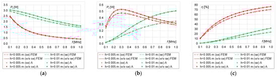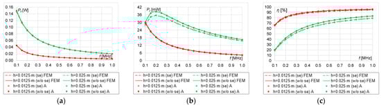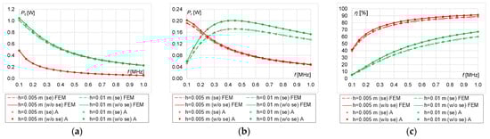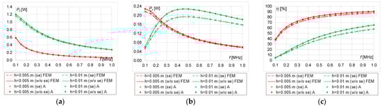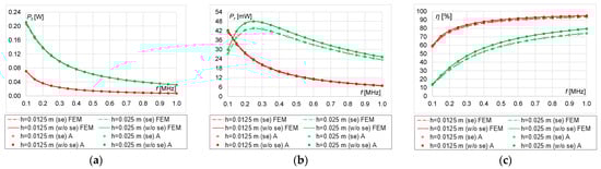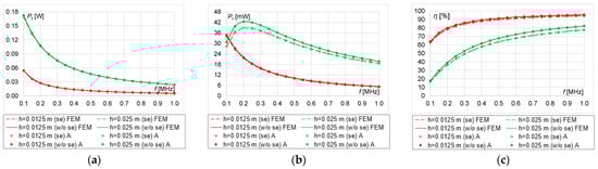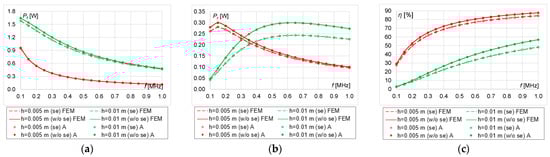 In this operation procedure, η tends to a maximum of 50% then maximum power is supplied to the load (Figure 17c, Figure 18c, Figure 19c and Figure 20c). At h = 0.01 m, η increases over the entire analyzed frequency range, regardless of n. As n increases, the influence of the skin effect on the efficiency of the system decreases (Figure 19c and Figure 20c). The greatest influence of the skin effect can be observed at h = 0.005 m and n = 10, 20 (Figure 17c and Figure 18c).
