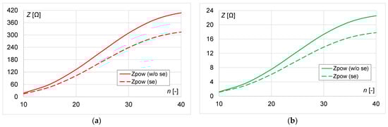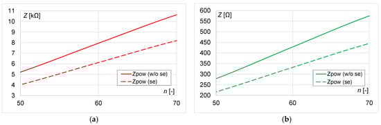 The lumped parameters of the electrical circuit were determined using Equations (12)–(13), (20)–(23). The values of the WPT system used in the analysis are presented in Table 2, Table 3, Table 4 and Table 5. When n increases, both impedances and the coil resistance increase. The skin effect increases the coil resistance and impedance Zeff. On the other hand, it causes a decrease in the impedance Zpow.