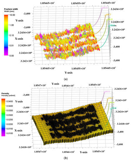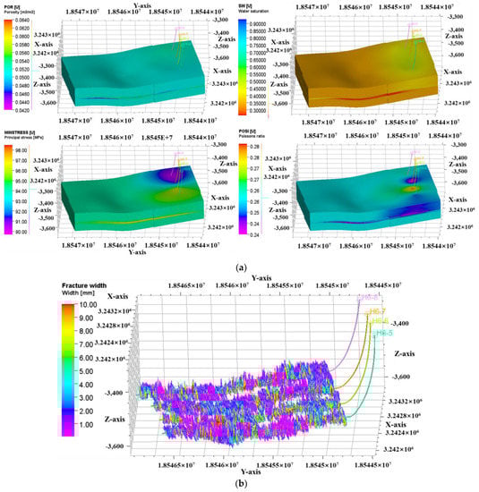 The structural model, attribute model, and geostress model were built with the logging and seismic data on the platform in the petrel (Figure 1a). Then, the fracturing propagation simulation was conducted by the actual pumping program of single well with the influence of natural fractures. The distribution of hydraulic fractures was supplied (Figure 1b). The specific geological and engineering parameters are shown in the Table 1.