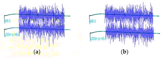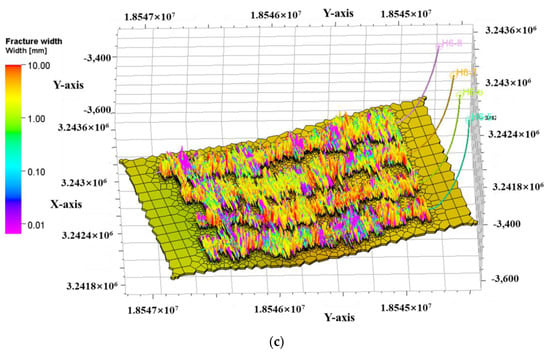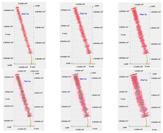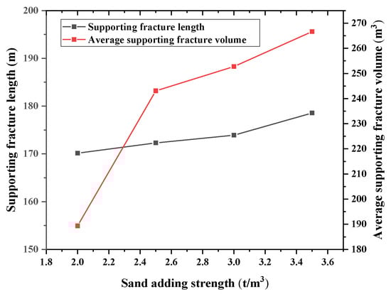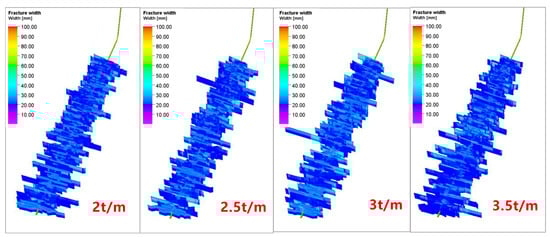 The integrated geological and engineering model simulates the proppant mass of fracture propagation from 2 t/m to 3.5 t/m based on the well’s H6-7 geological conditions (Figure 9). With the increase in the sand volume, the average length of the fracture is the same, but the volume of the supporting fracture increases. When the proppant mass is more than 2.5 t/m, the increase in the supporting fracture’s volume is slow (Figure 10).