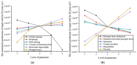 The change in cumulative production with the level of parameter in different factors: (a) engineering factors; (b) geological factors.