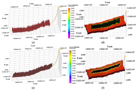 The different well trajectory angles of the fracture propagation: (a,b) is the numerical simulation of fracture propagation in 90°; (c,d) is the numerical simulation of fracture propagation in 70°; (e,f) is the numerical simulation of fracture propagation in 40°.