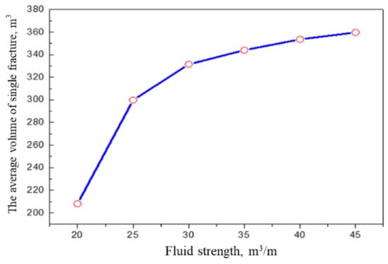 However, when the volume of fracturing fluid is increased from 30 m3/m to 45 m3/m, the volume of reservoir reconstruction increases slowly (Figure 8). At present, the average volume of fracturing fluid on the platform is 21.3 m3/m which has greater volume of fracturing fluid because of the low capability of production. On the other hand, the Young’s modulus of this platform is larger and the fracture length would be longer as a result. The optimal volume of the fracturing fluid is 25~30 m3/m for keeping safe wellbore pressure.