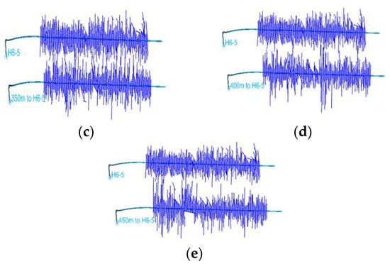 The fracture conditions under different well spacing: (a) 250 m; (b) 300 m; (c) 350 m; (d) 400 m; (e) 450 m.