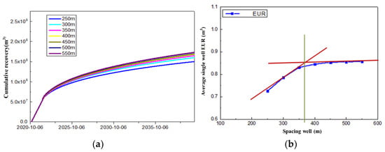 The cumulative recovery and average single well EUR under different well spacings: (a) the cumulative recovery; (b) the average single well EUR.