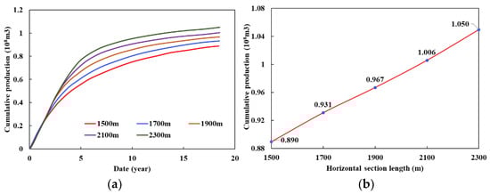 The change in cumulative production under different conditions: (a) different horizontal stage lengths under different dates; (b) different horizontal stage lengths.