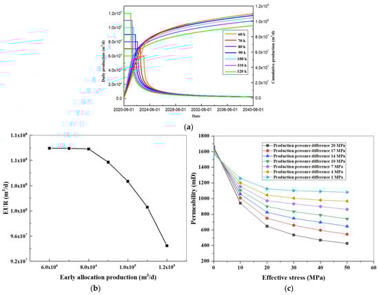 The change in cumulative production, EUR, and effective stress under different allocation production and permeability: (a) the 20 years of cumulative production; (b) the change of EUR; (c) the change in effective stress with the permeability of different production.