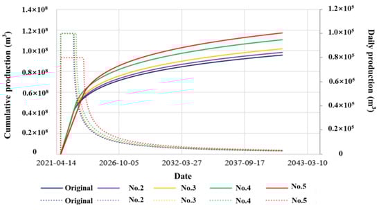 Based on all of these optimizations, there are five exploitation strategies as follows, which are designed to simulate the change in the EUR under different parameters such as well spacing and the volume of the fracturing fluid with the integrated geological and engineering model (Figure 15 and Table 4).