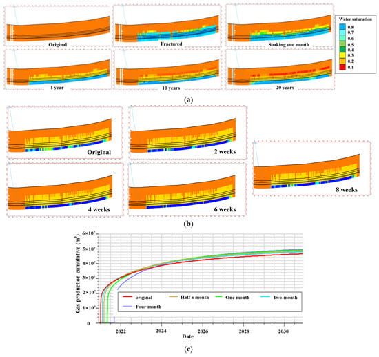 According to water injecting, the water and gas distribution after fracturing is simulated by the integrated geological and engineering model to study the difference and its impact on the EUR. For example, the change in water saturation at different periods is simulated and calculated for one month of soaking. As shown in Figure 16a, during the soaking time, water accumulates at the bottom of the fracture under gravity and displaces the surrounding gas which seeps into the matrix. Furthermore, the water saturation is simulated by the model for the original soaking period and the soaking periods of 2 weeks, 4 weeks, 6 weeks, and 8 weeks (Figure 16b).