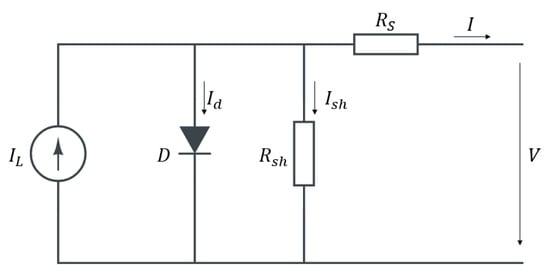 Based on simple circuit analyses and on the p-n junction working principle, it is possible to analytically define the current-voltage (I-V) characteristic of a solar cell through the Equation (1). Referring again to Figure 1, is the photogenerated current, is the current that passes through the diode, is the diode reverse current (also known as the diode saturation current) and is the current that passes through the shunt resistance. In Equation (1), is the thermal voltage, which is given by Equation (2) (usually assumed at room temperature, leading to a value of 26 mV), where k is the Boltzmann’s constant, T is the temperature and q is the electron charge, n is the diode non-ideality factor, is the series resistance associated to a voltage loss due to the cell’s connections and is the shunt/parallel resistance related to a current loss due to current leaks on the cell [,,].