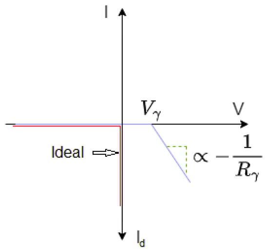 The model proposed in this work considers the solar cell performance between two adjacent (experimental) points, which is equivalent to an analytical incremental calculation. In this way, the solar cell diode is decomposed into a set of adjustable parallel diodes, to attain an increased overall precision in the considered solar cell voltage range. Figure 2 presents an equivalent model of the diode in the solar cell model. The subset model is composed of an ideal diode (an ideal electrical switch, which might be characterised as a diode with null voltage drop at on-state, null on-state resistance, infinite breakdown/reverse voltage and without parasitic capacitive effects), in series with a given resistance and an ideal independent voltage source. Figure 3 represents the I-V curve obtained from this equivalent model. The ideal diode has its characteristic in red and the curve of the entire serial branch is in light blue. The diode is at on-state (as an ideal closed switch) whenever its anode voltage is above the voltage source V. With the ideal diode at on-state, the branch collects current from the model current source, leading to less available current at the cell terminals. The slope of the I-V curve with this diode equivalent model is then proportional to .