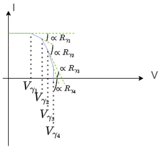 Based on this approach, it is possible to extend the concept in order to connect two adjacent points in the I-V curve obtained experimentally, as suggested in Figure 4. As can be seen, the slope between these two adjacent points is dependent on the resistance of the branch. On the other hand, with a specific sizing methodology, the ideal diode at branch N can become responsible to activate the respective branch, considering the effect of the entire N-1 parallel branches previously activated. The N branch resistance is only associated with the angle to adjust the previous slope to the next one, meaning that the resistance value is based on the previous and on the pretended slope, m. The resultant calculation process is equivalent to adding weighted resistances in parallel to attain a curve fitting to the experimental data. The mathematical formalism is presented in the system of Equation (6) and Figure 5 is the illustration of the obtained equivalent circuit model for N branches.