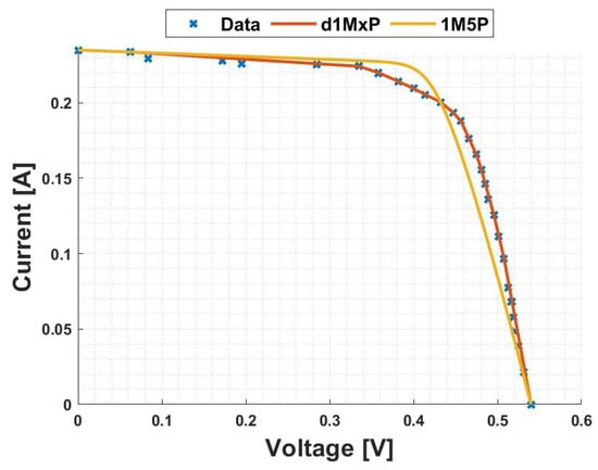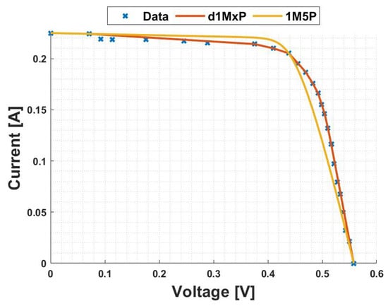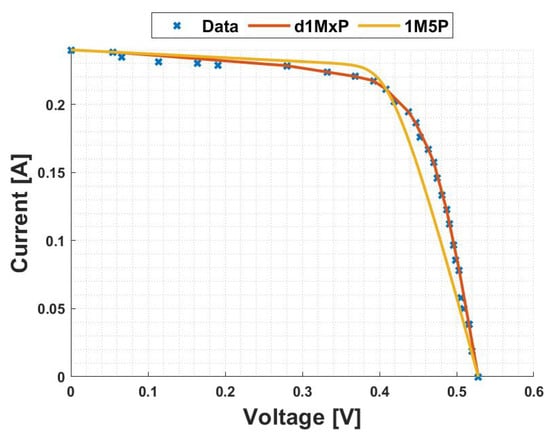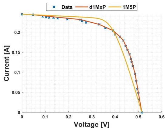 The I-V characteristics of the solar cell at 40 °C are illustrated in Figure 8, for the same load condition. At this temperature, the five parameters of the 1M5P model were computed as 0.237 , 3.105 × 10, 0.461, 47.583 and = 0.403 , resulting in a curve similar to the one obtained for 25 °C. The parameters computed to obtain the d1MxP curve are summarised in Table 2 (in this case ). As before, the curve shape keeps tracking the experimental data with more accuracy than the classical 1M5P model.