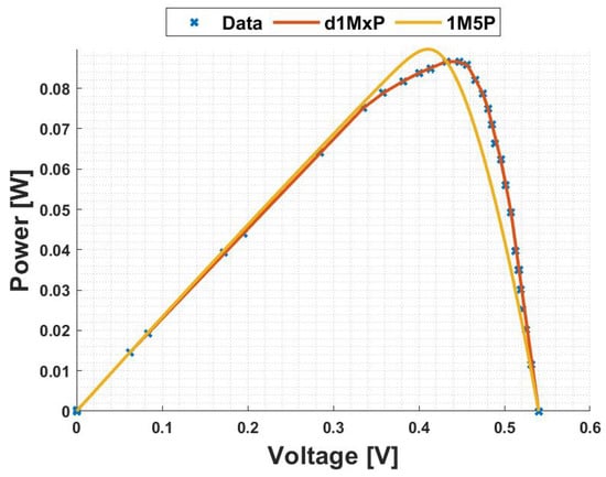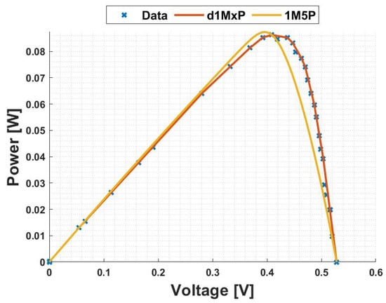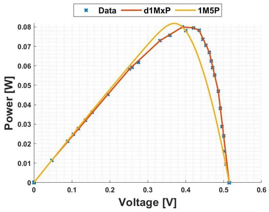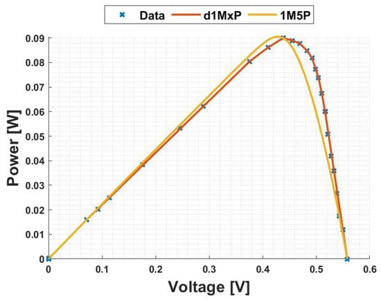 The P-V characteristics at 25 °C are presented in Figure 7 for the proposed d1MxP model, in comparison with the P-V curve obtained with the 1M5P models. As can be confirmed, the curve for the proposed model (in red) presents a more precise fitting to the experimental data, which results in a more accurate quantification of the maximum power point.