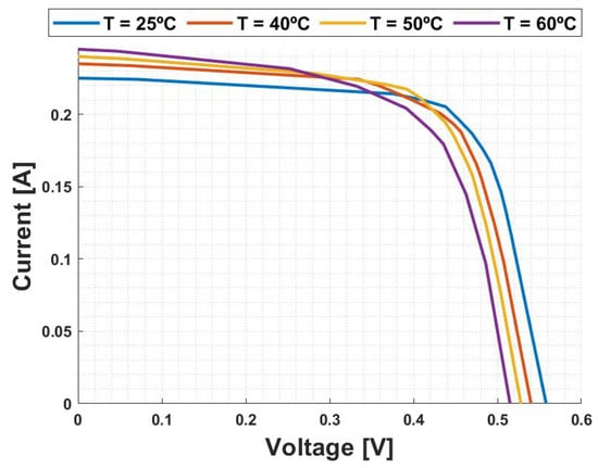 The cell temperature has a significant impact on the behaviour of the I-V and P-V characteristic curves [,,,,,,,]. In order to evaluate the model under study, taking into account the significant impact of temperature, several tests at different temperatures were analysed. Due to its matured scientific phenomena knowledge, the model evaluation and validation is based on mono-crystalline silicon cells technology.