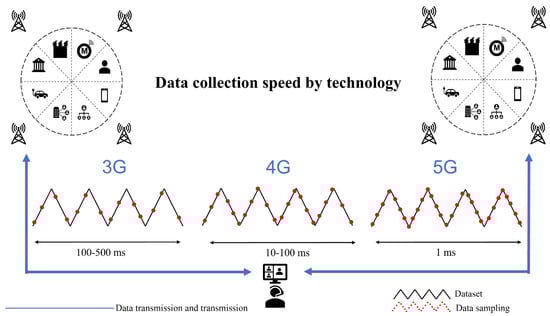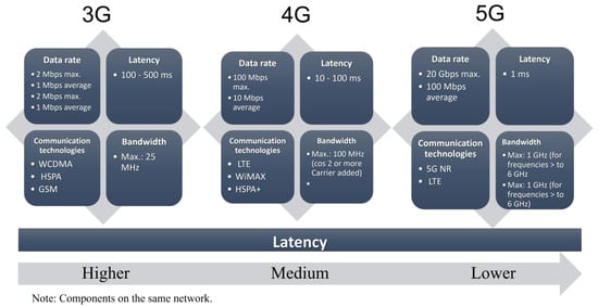 The new generation of communication networks has several features, such as data transfer of 1–10 gigabits per second (Gbps), high bandwidth, ultralow latency, reliable connection between devices, mass communication between machines, high energy efficiency, simultaneous redundancy, and a prosumer []. Figure 6 presents a comparison of three types of networks.