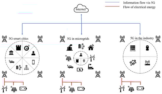 As shown in Figure 8, different researchers proposed the integration of 5G together with smart cities, MGs, and industry. In the case of smart cities, the integration system is proposed to be under constant monitoring of the use of electricity by the end user in real time. It can be achieved by using smart meters with free access to this consumption for both the distributor and users, regardless of the type of services they consume.