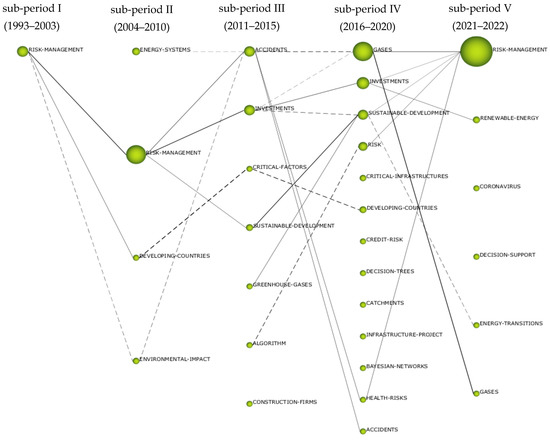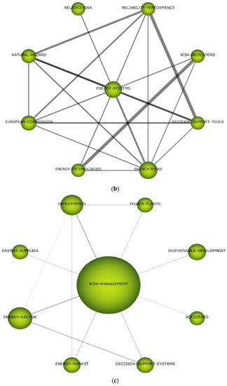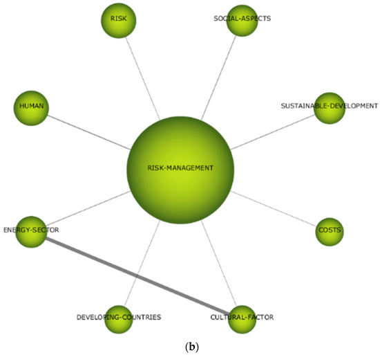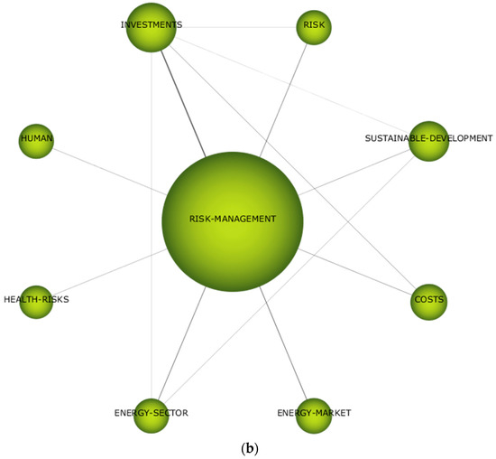 - The average number of citations is highest in the cluster centred around the keyword SUSTAINABLE-DEVELOPMENT, which is placed in quadrant four. This indicates that this is a developing topic that is under-recognised in the context of risk management issues in the energy sector. It may provide suggestions for future research into common issues: risk management, energy sector, and sustainable development.