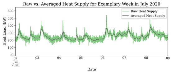 Having a preprocessed heat generation profile, one can try to convert this into a heat load profile. The measured heat generation profile mainly differs from the desired heat load profile due to the thermal inertia of the distribution pipes and radiators within the building. The heat generation curve was, therefore, smoothed by averaging over a centered Gaussian window. Different window sizes and standard deviations were tested. To remove all switching fragments, the window was, finally, chosen to be 180 min long with a standard deviation of 40 min. The Pearson correlation coefficient between the raw and the smoothed data is 0.93 while the total heat demand remains unchanged. As an example, Figure 1 displays both the measured heat generation and the smoothed heat load profile over one week in July.
