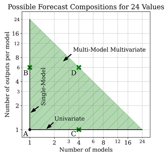 The different possibilities of composing a forecast consisting of 24 predicted values are sketched in Figure 2. Along the horizontal axis, the number of models and, along the vertical axis, the number of outputs from each model varies from 1 to 24. Both scales are displayed logarithmically with base two. By A, B, C and D, four examples of the four strategies are highlighted.
