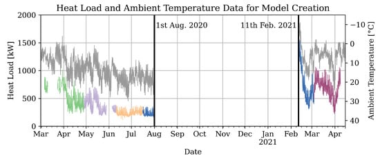 Heat load (colored) and ambient temperature data (grey) available for model development. The five different test sets from the five-fold nested cross-validation are highlighted by different colors in the heat load data. The period between 1 August 2020 and 11 February 2021 was removed for later application of the developed forecast models.