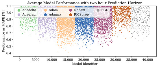 Figure 4 exemplifies the results regarding the optimizer selection for the +2-test-horizon. For this representation, all tested models were sorted by the optimizer used and colored accordingly. On the x-axis, a consecutive integer number is used as model identifier. On the y-axis, the average MAPE from the five folds is given. About 40,000 models with different randomly chosen parameter combinations were trained and tested. All models represented by the same color use the same optimizer but differ in all other parameters. Few duplicates–in the sense of models with identical parameter combinations–are possible, due to random parameter selection. This display illustrates whether a specific optimizer allows for a higher achievable model performance irrespective of all the other model parameters.