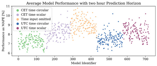 One typical example is the time-of-day input. Apart from the popular representations by a scalar continuous feature (0 to 1) or a vector of binary features from one-hot-encoding ( to ), further possibilities exist. Two of which are, encoding time of day circularly by sine-cosine functions in two features (e.g., used in [27]) or encoding time categorically by five binary features in case of an hourly resolution (e.g., used in [28]). Furthermore, time-of-day can be given in local time, possibly containing clock changes, or in coordinated universal time (UTC), representing time continuously. Step three clarifies whether one of these representations results in a superior model performance. Testing of the different parameter combinations is based on a random search approach.