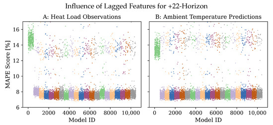Significant differences among the three test horizons were only observed for the scaling choice. A common observation is that omitting any scaling causes below average performance. Less clear among the three horizons is which scaling results in the best performing models. For the +42-models, min-max scaling to [0, 1] for both heat and ambient temperature clearly outperforms the other scaling choices, whereas all three scaling choices result in equally well performing models for the other two test horizons +2 and +22. Since min-max scaling to [0, 1] for both heat and temperature proved beneficial for one test horizon and produces comparable results for the other test horizons, it was selected for further usage.