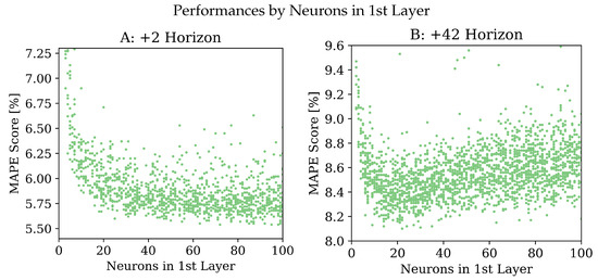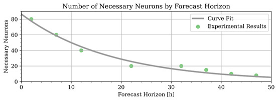 As opposed to single-model forecasting (singleXone and singleXseq), multi model forecasting (multiXone and multiXseq) requires several models. However, the given task of each model is very similar, since only the forecast horizon varies. In the presented case study, the first model predicts one hour ahead, the second model two hours ahead and so on. As a hypothesis, due to the similar task of each model, well performing FFNN models for each task may have many properties in common. To test this hypothesis, only three models with three different prediction horizons, termed test horizons, were initially developed. Three test horizons were chosen, because three is considered the minimal number of models, where common properties are unlikely to be accidental. The three chosen test horizons are 2, 22 and 42 h ahead. The three horizons reflect a relatively short, a medium and a relatively long horizon compared with the full time period needed (48 h ahead). Thereby, they reveal differences between short-term and long-term forecasting within the necessary forecast horizons. The exact numbers of 2, 22 and 42 could have been chosen differently as well. Purposely avoided, however, were horizons that coincide with the seasonality of the measured data (e.g., 24 or 48 h ahead). As a result of the three test horizons, the properties shared by all three best performing test models will be kept constant for all other models without further testing. Depending on the number of common properties, this simplifies model development for the remaining 45 models considerably.