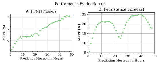 Due to a daily seasonality, the accuracy of the persistence forecast is typically improved if the forecast horizon meets the daily seasonality. This means that the persistence forecast with 24 h horizon outperforms the persistence forecast with 22 h horizon. Consequently, the 22 h ahead FFNN model (+22-model) is also compared with the 24 h ahead persistence forecast, and the 42 h ahead FFNN (+42-model) is compared with the 48 h ahead persistence forecast. The MAPE scores of the +24-persistence forcast and the +48-persistence forecast are 12.5% and 17.8%, respectively. Irrespective of the specific horizon, the initial FFNN models clearly outperform the persistence forecasts.