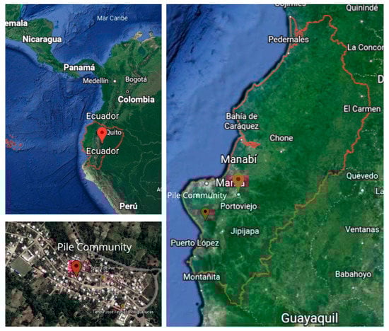 In the case of clean drinking water, the expansion or creation of water treatment projects in rural areas becomes difficult mainly due to economic and technological constraints in many developing countries [9]. This infrastructure deficiency often forces people to use this vital liquid without prior disinfection and treatment. According to the World Health Organization, about two billion people consume raw water mainly contaminated with stool, transmitting diarrhea, cholera, dysentery, typhoid, and polio [10]. These diseases are caused by intestinal parasites, which mainly affect people in rural areas of low-income countries [11], considering that these can also lead to chronic malnutrition in children [12]. In addition, this issue causes people to incur more medical expenses, reducing their economic capacity. Similarly, in many regions of Latin America, the availability of clean drinking water has decreased due to the considerable increase in the demand for this vital liquid [13]. According to UNICEF, Ecuador still has deficiencies in this type of infrastructure, affecting about 30% of the total population, who do not have access to safe water [14]. In 2015, clean drinking water coverage in this country reached 80.4% [15]. In the province of Manabi, where Pile is located, the clean drinking water coverage reached 64.7%. Given this, the lack of or reduced access to clean drinking water often forces people in rural areas to develop habits that can negatively affect their health, such as drinking untreated water directly from natural sources (wells, lakes, and rivers).