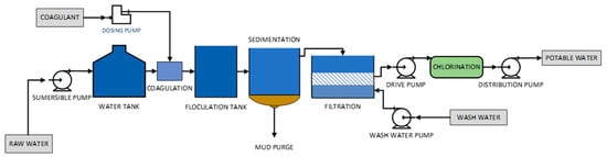 Microgrids based on renewable energy can deliver power to plants operating with different drinking water treatment technologies to provide safe drinking water to their communities [21]. Usually, the electricity consumed by treatment plants is obtained from high- or low-voltage transmission grids from large-scale power plants [22], because these are energy-intensive technologies [23]. This section focuses on the electricity supply to a drinking water treatment plant (DWTP) because this technology is suitable for treating the raw water existing in the community studied in this work. This plant technology is based on physical and chemical treatment processes of raw water to eliminate microorganisms [24], considering this is intended to supply water to the local population through water supply systems [25]. The construction of water treatment infrastructure in rural areas is more challenging than in urban centers due to its high costs, including costs related to operation and maintenance, and its limited expansion opportunities [26]. In terms of the energy use of this infrastructure, microgrids can supply the high amounts of electricity that are required in processes related to drinking water treatment, such as water extraction, treatment, storage, and distribution.