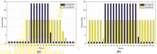 Figure 3 shows the plant’s power consumption on a typical day in years 1 and 15, considering the 12H-DWTP and 24H-DWTP configurations. As can be seen in Figure 3a, the 24H-DWTP operated fewer hours daily due to the lower demand for clean drinking water from the community during the first year of operation. This was similar for the 12H-DWTP. In the case of year 15 (Figure 3b), both configurations operated at maximum clean drinking water supply conditions.